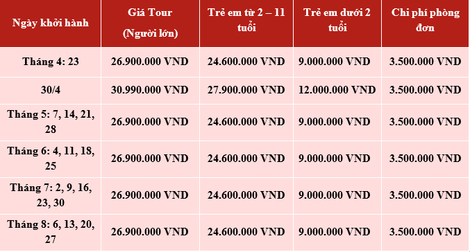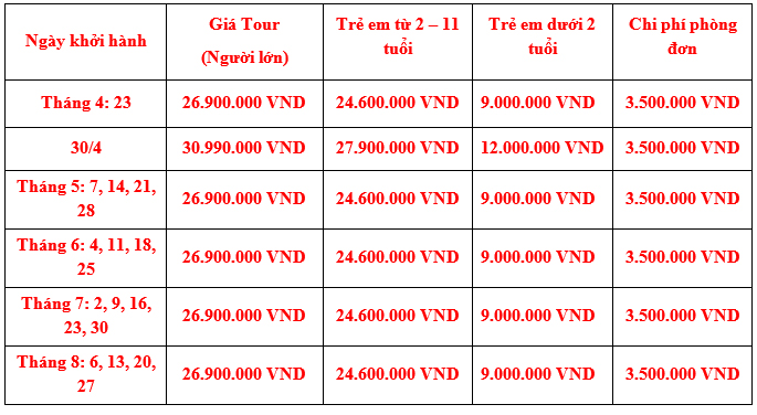 GIÁ TOUR: VNĐ/KHÁCH